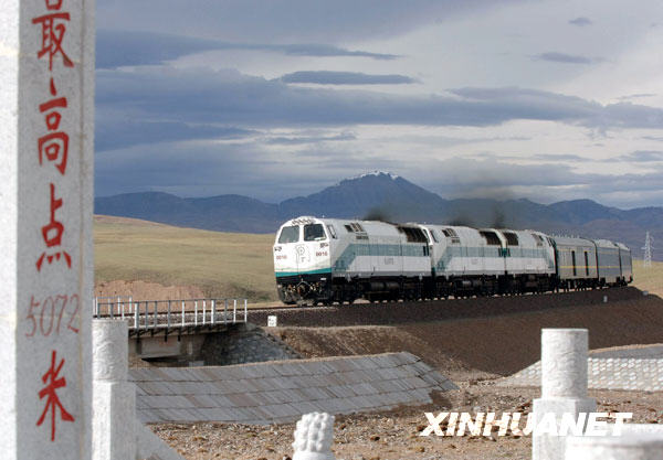 這是2006年7月1日18時37分,從格爾木發(fā)出的“青1”次列車順利通過海拔5072米的世界鐵路最高點——唐古拉山口。當日,青藏鐵路全線通車。新華社發(fā)