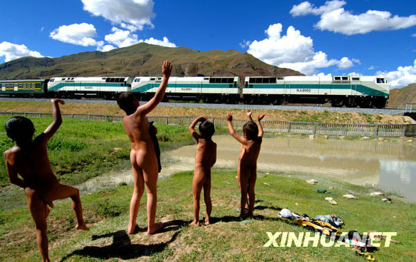 這是在西藏堆龍德慶縣鄉(xiāng)村,在鐵路旁嬉戲的藏娃向行駛的火車揮手(2006年7月21日攝)。新華社發(fā)
