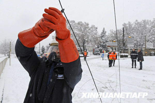 12月14日,一名電力工人在法國中部城市布拉薩克萊米訥搶修供電設(shè)備。新華社/法新