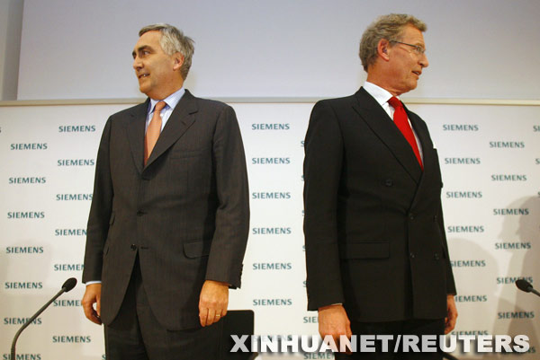 12月15日,在德國(guó)慕尼黑,西門子公司總裁彼得· 勒舍爾(左)和監(jiān)事會(huì)主席格哈德·克羅默準(zhǔn)備出席新聞發(fā)布會(huì)。據(jù)德國(guó)西門子網(wǎng)站當(dāng)日公布的消息,西門子公司以支付約10億歐元(13億美元)罰金的代價(jià),于當(dāng)日結(jié)束了美德兩國(guó)指控其向政府人員行賄的官司。新華社/路透