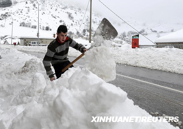 12月15日,一名男子在西班牙北部帕哈雷斯鎮(zhèn)的道路邊鏟雪。襲擊西班牙北部地區(qū)的大雪阻斷了連結(jié)萊昂和阿斯圖里亞斯地區(qū)的公路。西班牙的氣象部門已經(jīng)向一些地區(qū)發(fā)布了暴雪警報(bào)。新華社/路透