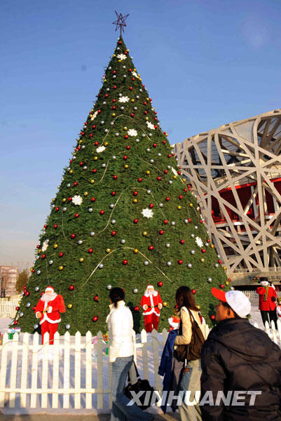 12月23日,游客在國(guó)家體育場(chǎng)(“鳥巢”)前參觀大圣誕樹。當(dāng)日,一棵高24米,底盤直徑為12米的圣誕樹在國(guó)家體育場(chǎng)(“鳥巢”)前布置完成。除了這棵大型圣誕樹外,奧林匹克公園內(nèi)還搭建了110棵5米高的圣誕樹。這些圣誕樹與圣誕木屋以及各種彩燈和裝飾掛件把奧林匹克公園裝扮得格外美麗。