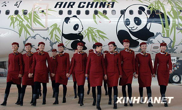 12月25日,國航西南分公司的空乘人員迎接“秀美四川”號彩繪飛機出廠。當日,以水墨畫風格噴涂大熊貓母子親密形象的第二架“秀美四川”號彩繪飛機在成都亮相。據(jù)悉,國航將使用兩架嶄新的“秀美四川”號A321彩繪飛機來執(zhí)行成都至臺北航線。