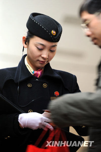 1月8日,長沙開往北京西的Z17列車女子乘務(wù)組乘務(wù)員為一名旅客服務(wù)。1月8日,隨著30組臨客在長沙的全部集結(jié)到位,廣鐵集團2009年春運湖南地區(qū)準(zhǔn)備工作基本就緒。2009年春運將于1月11日正式開始,長沙客運段已備足全部旅客列車的相關(guān)物品,并吸取去年冰雪災(zāi)害運輸教訓(xùn),制定應(yīng)急預(yù)案,儲備應(yīng)急設(shè)備,確保春運工作安全有序進行。