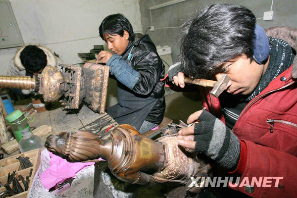 尼泊爾技師巴格達(dá)(前)在鏨刻銅質(zhì)佛像(1月13日攝)。安徽帝雅文化遺產(chǎn)研究保護(hù)中心針對宗教藝術(shù)品的市場需求,從尼泊爾聘請六名富有經(jīng)驗的鏨刻技師,開發(fā)宗教銅器藝術(shù)品。