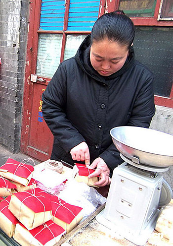 1月13日,在北京前門大柵欄西街,一位制售老北京香酥糕的個體戶,在為顧客包裝香酥糕。墊上喜慶的紅紙,用紙繩系緊,這種既環(huán)保又懷舊的包裝形式吸引了不少顧客。