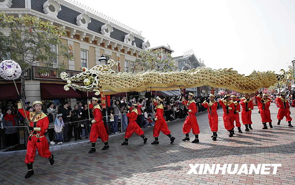 1月15日,演員在預(yù)演“福到滿(mǎn)城賀金牛”新春節(jié)目——舞龍。為慶祝中國(guó)農(nóng)歷新年,香港迪士尼樂(lè)園裝飾一新,并將于1月16日至2月8日為游客推出以“福到滿(mǎn)城賀金!睘橹黝}的多個(gè)喜慶吉祥的節(jié)目,與游客共慶傳統(tǒng)佳節(jié)。