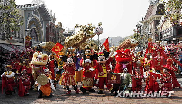 1月15日,穿上賀年新裝的迪士尼卡通人物米奇、米妮、高飛和眾演員為觀眾送上新春祝福。
