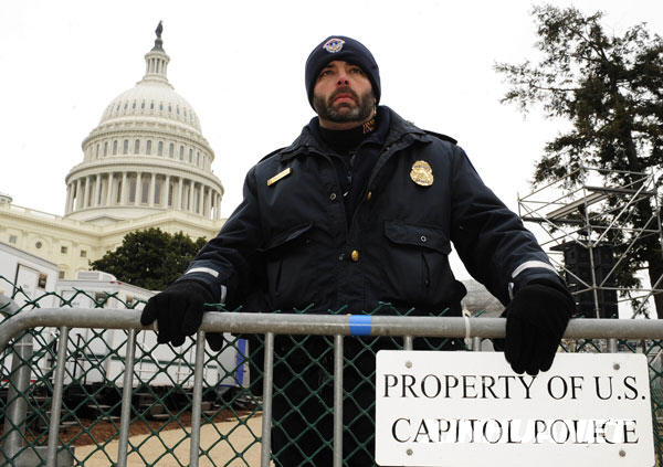 1月18日,一名警察在美國(guó)首都華盛頓的國(guó)會(huì)山前執(zhí)勤。1月20日,美國(guó)當(dāng)選總統(tǒng)奧巴馬的宣誓就職典禮將在這里舉行。為確保此次活動(dòng)安全進(jìn)行,屆時(shí)將有7500名現(xiàn)役軍人、1萬名國(guó)民警衛(wèi)隊(duì)成員和2.5萬名各類執(zhí)法人員執(zhí)行各類安全任務(wù)。