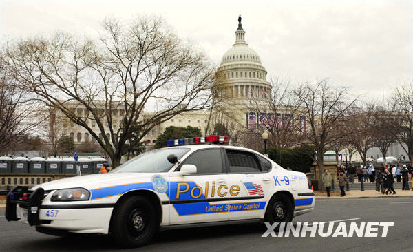 1月18日,在美國(guó)首都華盛頓,一輛巡邏警車從國(guó)會(huì)大廈前經(jīng)過。