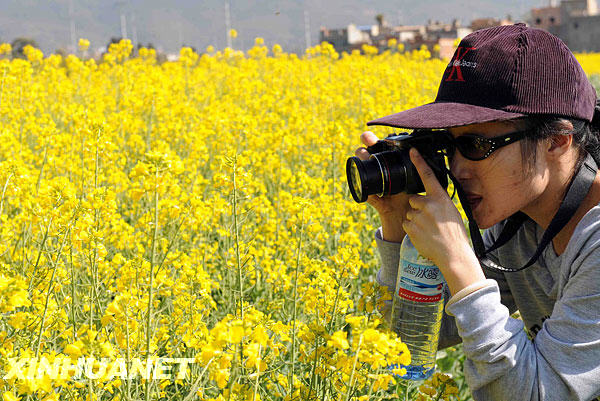2月1日,一名來自北京的游客在云南玉溪市鄉(xiāng)村拍攝油菜花。春節(jié)期間,云南大部分地區(qū)陽光明媚,人們紛紛到鄉(xiāng)村觀賞美景,休閑度假。