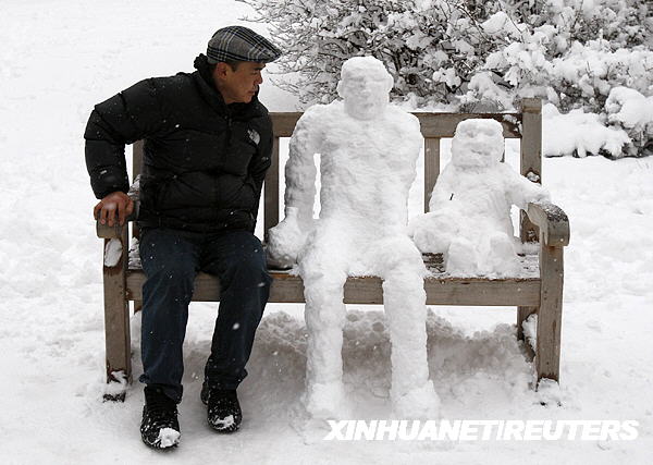 2月2日,在英國(guó)首都倫敦的一個(gè)公園里,一名男子坐在堆有雪人的長(zhǎng)椅上。當(dāng)日,大雪造成倫敦市所有公共汽車和部分火車停運(yùn),機(jī)場(chǎng)也被迫關(guān)閉。新華社/路透