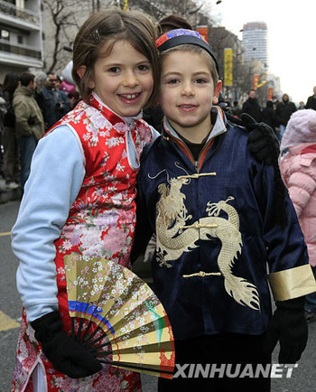 2月1日,兩名兒童身著中國(guó)傳統(tǒng)服裝在法國(guó)巴黎13區(qū)“中國(guó)城”參加迎新春游行。當(dāng)天,法國(guó)巴黎13區(qū)“中國(guó)城”舉行一年一度的迎新春大游行,吸引了眾多當(dāng)?shù)孛癖娗皝?lái)觀賞。