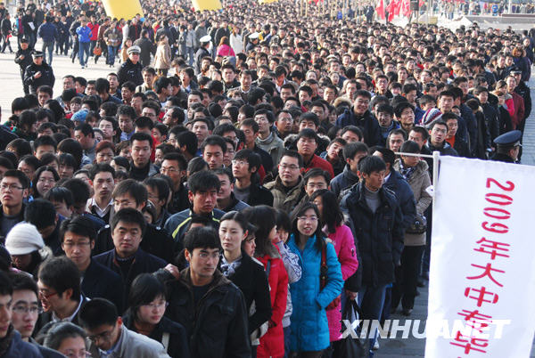 2月3日,在煙臺(tái)市國際博覽中心,應(yīng)聘者排起長隊(duì)等候進(jìn)場。當(dāng)日,山東省煙臺(tái)市舉行2009年應(yīng)屆大中專畢業(yè)生供需洽談會(huì),900多家單位提供1.5萬個(gè)就業(yè)崗位,吸引了各地5萬余名學(xué)子到場應(yīng)聘。