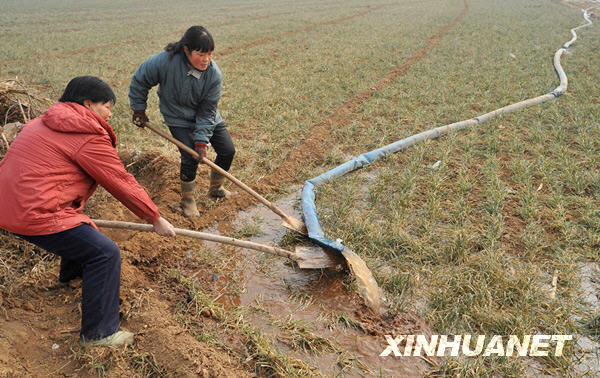 2月4日,村民引來(lái)洛河水灌溉農(nóng)田。由于2008年10月以來(lái)一直缺少有效降水,河南大部分地區(qū)出現(xiàn)不同程度的旱情。其中僅洛陽(yáng)市高新區(qū)辛店鎮(zhèn)辛店村小麥?zhǔn)芎得娣e就達(dá)1000多畝,目前全村正動(dòng)員干部群眾進(jìn)行農(nóng)田灌溉,現(xiàn)已有三分之一的受旱農(nóng)田完成灌溉。