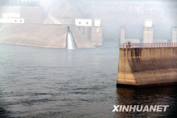 這是2月5日拍攝的黃河小浪底大壩出水口一角。