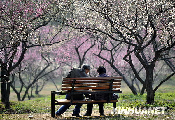 2月9日,兩位老年人在武漢東湖梅園中的長椅上休息。占地800多畝的武漢東湖梅園擁有梅花品種309種,植梅1萬余株,自1983年來,每年的中國武漢梅花節(jié)都在此舉行。今年梅花節(jié)自春節(jié)開幕以來,梅園已接待游客6萬多人。