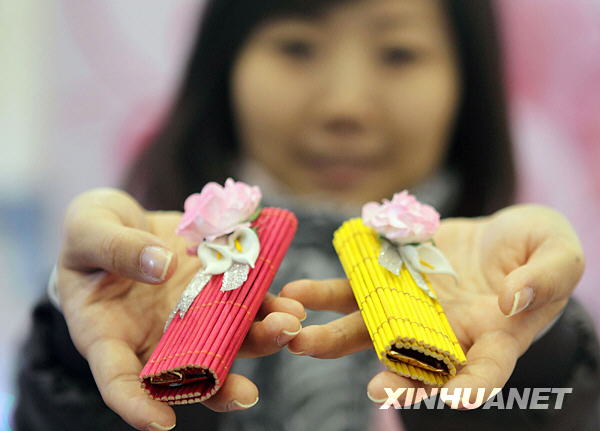2月15日,一位工作人員在展會現(xiàn)場展示草編的喜糖包裝。