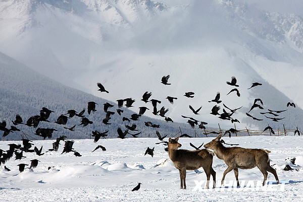 2月14日,兩只馬鹿與一群烏鴉在哈密天山腳下覓食。