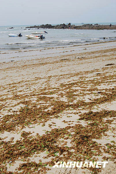 2月17日,工作人員清理后的海灘不多時又覆蓋上了一層海藻。連日來,北海市受東南風影響,部分海灘出現(xiàn)大量海藻,其中市區(qū)西部的冠頭嶺腳下情況最為嚴重,海灘被厚達數(shù)厘米的黃褐色海藻覆蓋,景區(qū)管理人員及時對此進行了清理。當?shù)貪O民稱,每年春天,都有這種俗稱“海木耳”的藻類被東南風刮到岸邊。