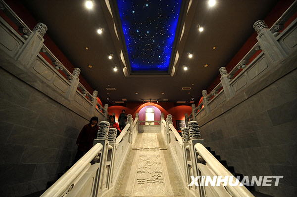 2月18日,人們在明孝陵博物館新館內(nèi)的模擬地宮入口處參觀當(dāng)日,占地面積約5000平方米的南京明孝陵博物館新館對外開放。博物館平面呈“回”字形,由《大明孝陵》主題展覽、360度環(huán)幕影院、書吧、文化產(chǎn)品超市等組成。展廳主色調(diào)為紅色和明黃,門樓、立柱等細(xì)節(jié)設(shè)計(jì)體現(xiàn)出明代皇家建筑特征。