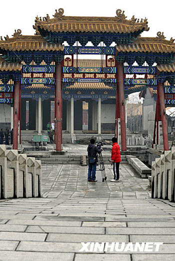 2月19日,兩位記者在濟南府學(xué)文廟屏樓前拍攝。