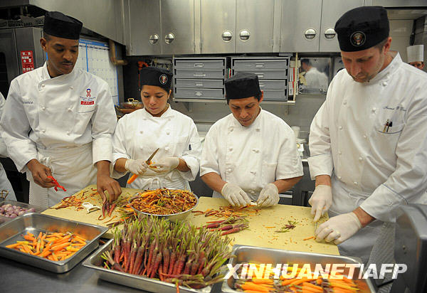 2月22日,在美國華盛頓白宮的廚房里,廚師們正在為宴請州長的晚餐而忙碌。新華社/法新