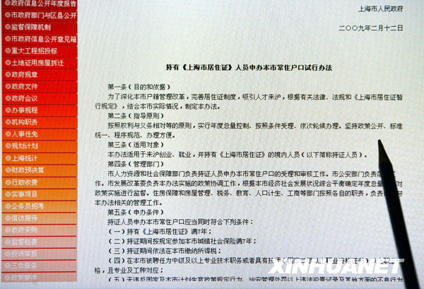 上海政府網(wǎng)站上發(fā)布的“戶籍新政”(2月23日攝)。