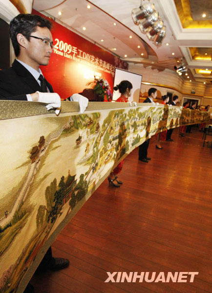 2月26日,工作人員在展示十字繡作品《清明上河圖》。當(dāng)日,一幅臨摹名畫《清明上河圖》巨幅十字繡作品在滬亮相。這幅繡品長22米,由10位技師耗時近6個月制作而成,所用繡線總長達(dá)116.5公里。