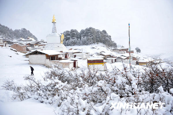 連日來,甘肅省甘南藏族自治州大部分地區(qū)普降大雪,這場降雪有效緩解了甘南草原的旱情。甘南州碌曲縣境內(nèi)著名的旅游勝地郎木寺在大雪中景色更顯奇異。