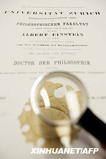 3月8日,在瑞士盧塞恩的菲舍爾畫廊,一名工作人員拿放大鏡觀看愛因斯坦的博士學(xué)位證書。瑞士菲舍爾畫廊3月6日宣布,將在6月份拍賣著名理論物理學(xué)家、相對論創(chuàng)始人阿爾伯特·愛因斯坦1906年在蘇黎世大學(xué)獲得的博士學(xué)位證書。新華社/法新