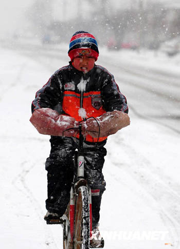 3月11日,一名少年騎車走在鄂爾多斯市杭錦旗獨貴塔拉鎮(zhèn)街頭。當日,內(nèi)蒙古自治區(qū)中西部的呼和浩特、包頭、鄂爾多斯、巴彥淖爾等地出現(xiàn)大范圍降雪,氣溫隨之下降。
