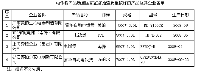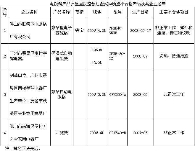 電飯鍋:抽查了廣東、浙江、上海、江蘇4個(gè)省、直轄市39家企業(yè)生產(chǎn)的40種產(chǎn)品,產(chǎn)品實(shí)物質(zhì)量合格率為90%。這次抽查,重點(diǎn)對(duì)觸及帶電部件的防護(hù)、非正常工作、發(fā)熱等16個(gè)安全指標(biāo)和2個(gè)電磁兼容指標(biāo)進(jìn)行了檢驗(yàn)。抽查中發(fā)現(xiàn)的主要質(zhì)量問題是非正常工作和發(fā)熱不合格。