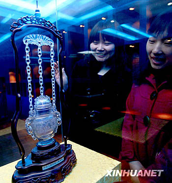 3月19日,兩名游客在圣時水晶博物館內(nèi)觀賞水晶工藝品。
