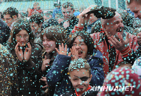 3月22日,在比利時東部的小城斯塔沃洛,參加狂歡節(jié)慶祝的人們?nèi)肀蝗鰸M碎紙片。