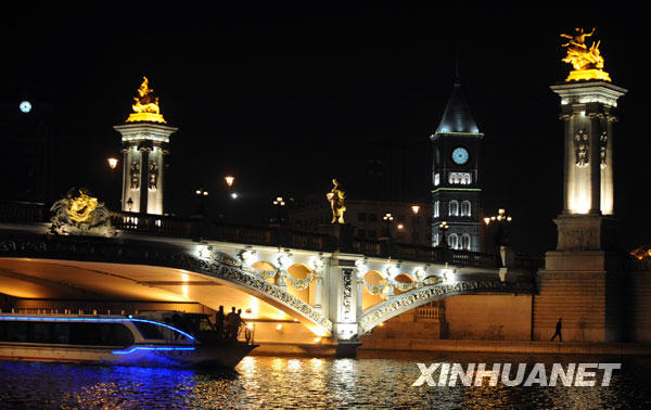 從天津三岔河口到塘沽入?,海河上排列點綴著24座橋梁。這些橋梁造型不同,各具特色,不僅是兩岸交通及經(jīng)貿(mào)文化交流紐帶,也凝聚了天津歷史的深厚底蘊,同時,海河上的“一橋一景”還是一條絢麗多彩的觀光帶。
