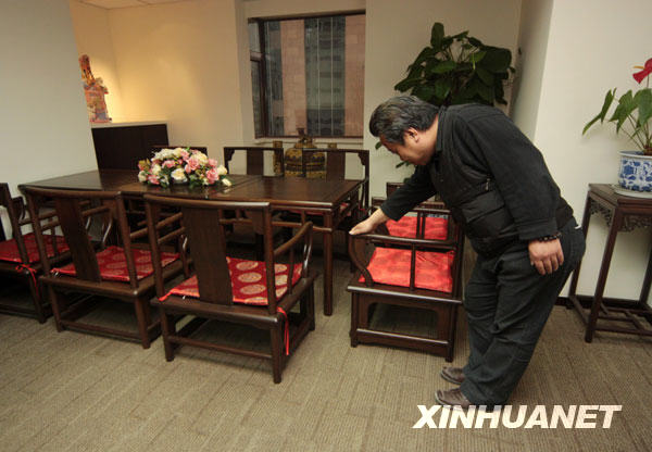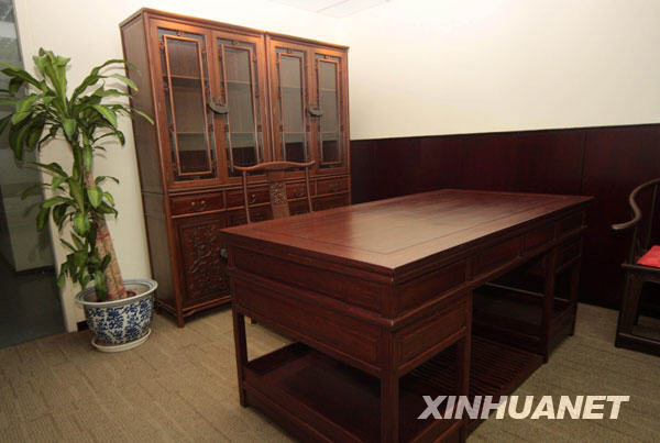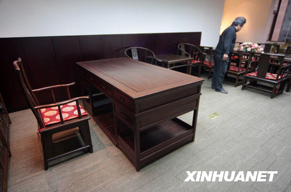 3月23日拍攝的展出的“羅格奧運辦公家具”。據(jù)悉,國際奧委會主席羅格在北京奧運會期間使用過的20件仿古風格辦公家具將于3月底在北京拍賣。這套辦公家具以竹子為主料,包括書桌、官帽椅、書柜、會議桌椅、花幾、電視柜、圈椅等。