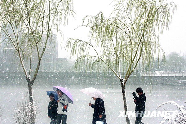 3月24日,山東濱州學(xué)院的幾名學(xué)生冒雪行走在校園里。當(dāng)日,山東部分地區(qū)迎來雨夾雪,個(gè)別地區(qū)還出現(xiàn)了中到大雪。專家介紹說,此次降雪有利于改善土壤墑情,但低溫也可能帶來凍害。新華社發(fā)