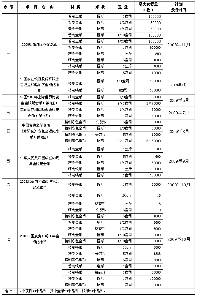 這7個項目分別為:2009版熊貓金銀紀念幣(其中包含中國農業(yè)銀行股份有限公司成立熊貓加字金銀紀念幣)、中國2010年上海世界博覽會金銀紀念幣(第1組)、第16屆亞洲運動會金銀紀念幣(第1組)、中國古典文學名著——《水滸傳》彩色金銀紀念幣(第1組)、中華人民共和國成立60周年金銀紀念幣、2009北京國際錢幣博覽會紀念銀幣、2010中國庚寅(虎)年金銀紀念幣。上述項目中,2009版熊貓金銀紀念幣已于2008年11月發(fā)行。