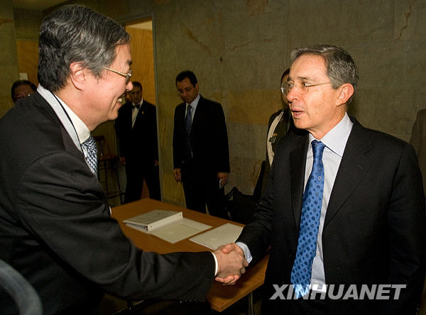 3月29日,在哥倫比亞第二大城市麥德林,中國人民銀行行長周小川(左)與哥倫比亞總統(tǒng)烏里韋舉行會談。當天,正在麥德林參加美洲開發(fā)銀行年會的周小川與烏里韋舉行會談,就進一步加強合作交換了意見。新華社發(fā)(戴維·德拉巴斯攝)