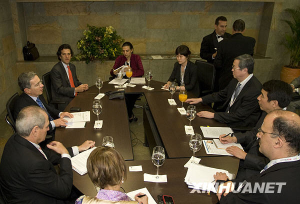 3月29日,在哥倫比亞第二大城市麥德林,中國人民銀行行長周小川(右三)與哥倫比亞總統(tǒng)烏里韋(左二)舉行會談。新華社發(fā)(戴維·德拉巴斯攝)