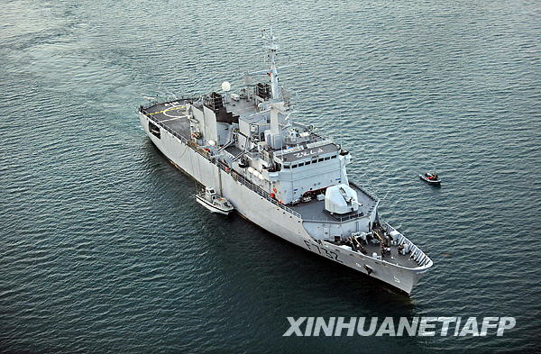 這是2008年11月25日在吉布提港附近海域拍攝的名為“Le Nivose”的法國(guó)軍艦。法國(guó)國(guó)防部2009年4月15日宣布,這艘法國(guó)軍艦當(dāng)天在肯尼亞附近海域巡邏時(shí)抓獲了11名海盜。