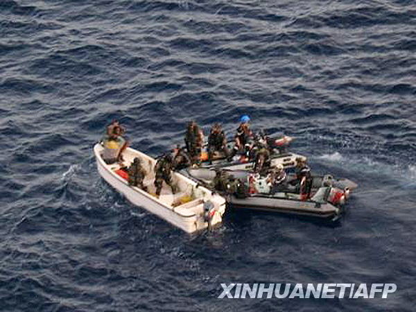 這張法國(guó)軍方公布的照片顯示,4月15日,法國(guó)士兵在肯尼亞附近海域抓獲海盜。