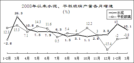 建材行業(yè)。一季度,全國水泥產(chǎn)量28049萬噸,同比增長12.9%,增速同比加快3.7個百分點(去年同期受低溫雨雪冰凍災害影響增速較低);平板玻璃產(chǎn)量13533萬重箱,增長0.5%,減緩12.4個百分點。