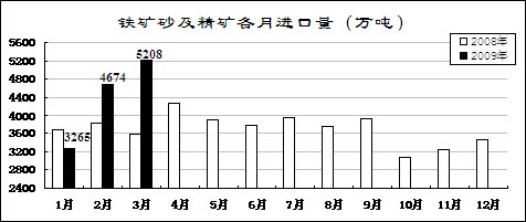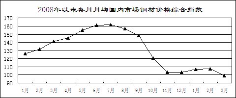 鋼材價格先升后降。受市場預(yù)期好轉(zhuǎn)和銷售企業(yè)補(bǔ)充庫存影響,鋼材價格從年初開始小幅回升,2月上旬國內(nèi)市場鋼材價格綜合指數(shù)為109.26,比去年12月最后一周回升5.96點(diǎn)。但由于有效需求沒有明顯恢復(fù)而生產(chǎn)增長較快,2月中旬開始鋼材價格持續(xù)大幅回落。3月最后一周,國內(nèi)市場鋼材價格綜合指數(shù)為97.16,比2月上旬回落12.1點(diǎn),低于去年最低水平4.33點(diǎn)。3月份,6.5mm高線、20mm中厚板平均價格分別為3368元/噸和3443元/噸,比去年最低的11月份下降6.9%和2.3%,同比下降33.5%和42.3%;1.0mm冷軋板卷4312元/噸,比去年最低的11月份上漲4%,同比下降34.3%。