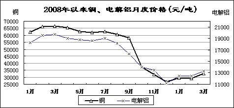 受國家收儲政策、企業(yè)大量停產(chǎn)減產(chǎn)等影響,主要有色金屬價格有所回升。3月份,國內(nèi)市場銅、電解鋁、鉛、鋅現(xiàn)貨平均價分別為32543元/噸、13261元/噸、12813元/噸和11735元/噸,比去年12月份回升21.3%、18.9%、22.5%和19.8%,同比下降51%、32.7%、40.9%和43.3%。