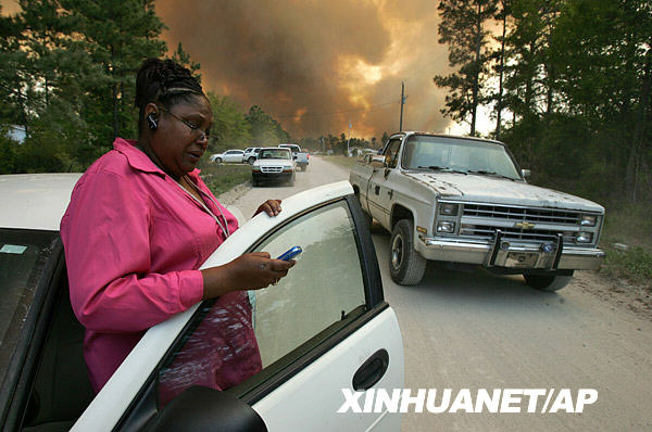 4月23日,在美國南卡羅來納州的霍里,一名婦女在山火襲來時給她的丈夫打電話。美國南卡羅來納州近日發(fā)生山火,已經(jīng)造成數(shù)十所房屋被毀,數(shù)百人離開家園。新華社/美聯(lián)