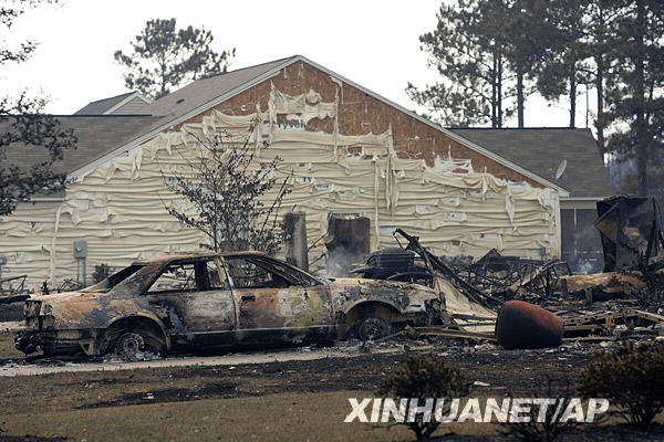 4月23日,在美國南卡羅來納州的北默特爾比奇,房屋和汽車被山火焚毀。美國南卡羅來納州近日發(fā)生山火,已經(jīng)造成數(shù)十所房屋被毀,數(shù)百人離開家園。新華社/美聯(lián)