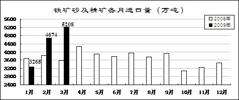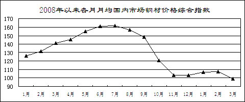 鋼材價(jià)格先升后降。受市場(chǎng)預(yù)期好轉(zhuǎn)和銷(xiāo)售企業(yè)補(bǔ)充庫(kù)存影響,鋼材價(jià)格從年初開(kāi)始小幅回升,2月上旬國(guó)內(nèi)市場(chǎng)鋼材價(jià)格綜合指數(shù)為109.26,比去年12月最后一周回升5.96點(diǎn)。但由于有效需求沒(méi)有明顯恢復(fù)而生產(chǎn)增長(zhǎng)較快,2月中旬開(kāi)始鋼材價(jià)格持續(xù)大幅回落。3月最后一周,國(guó)內(nèi)市場(chǎng)鋼材價(jià)格綜合指數(shù)為97.16,比2月上旬回落12.1點(diǎn),低于去年最低水平4.33點(diǎn)。3月份,6.5mm高線、20mm中厚板平均價(jià)格分別為3368元/噸和3443元/噸,比去年最低的11月份下降6.9%和2.3%,同比下降33.5%和42.3%;1.0mm冷軋板卷4312元/噸,比去年最低的11月份上漲4%,同比下降34.3%。