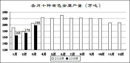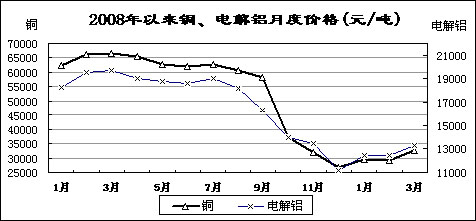 受?chē)?guó)家收儲(chǔ)政策、企業(yè)大量停產(chǎn)減產(chǎn)等影響,主要有色金屬價(jià)格有所回升。3月份,國(guó)內(nèi)市場(chǎng)銅、電解鋁、鉛、鋅現(xiàn)貨平均價(jià)分別為32543元/噸、13261元/噸、12813元/噸和11735元/噸,比去年12月份回升21.3%、18.9%、22.5%和19.8%,同比下降51%、32.7%、40.9%和43.3%。